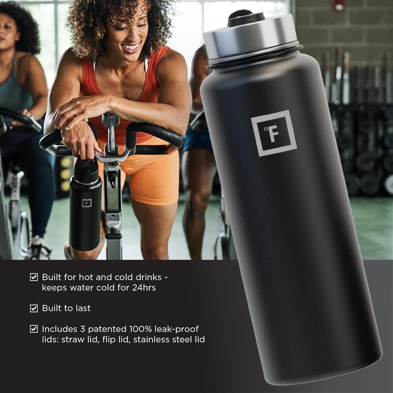 - 3 LIDS: YES, Iron Flask comes with THREE different 100% LEAK PROOF lids. Carabiner Straw Lid with 2 Straws, Flip Lid, and a Stainless Steel Lid! *NOTE: The stainless steel lid is plastic from inside and stainless steel from outside*